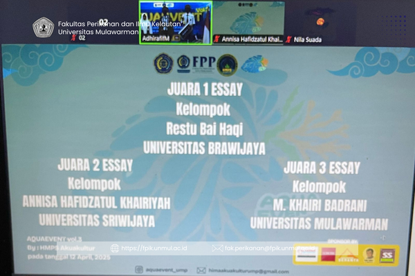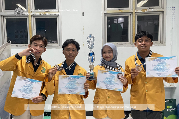 FPIK Unmul mengucapkan selamat kepada Mahasiswa perikanan dan ilmu kelautan universitas Mulawarman tim Muhammad Khairi Badrani, Marisa Elista, Haris Wijaya, dan Muh. Fahril Ramdani telah Meraih penghargaan atas Juara 3 Lomba Essai Nasional dalam kegiatan AQUAEVENT Vol. 3 Tahun 2025 yang diselenggarakan oleh Himpunan Mahasiswa Akuakultur, Fakultas Pertanian dan Perikanan, Universitas Muhammadiyah Purwokerto pada 12 April 2025. Kegiatan ini merupakan ajang bergengsi tingkat nasional yang bertujuan untuk mendorong kreativitas, inovasi, dan pemikiran kritis mahasiswa dalam bidang akuakultur serta isu-isu perikanan berkelanjutan.